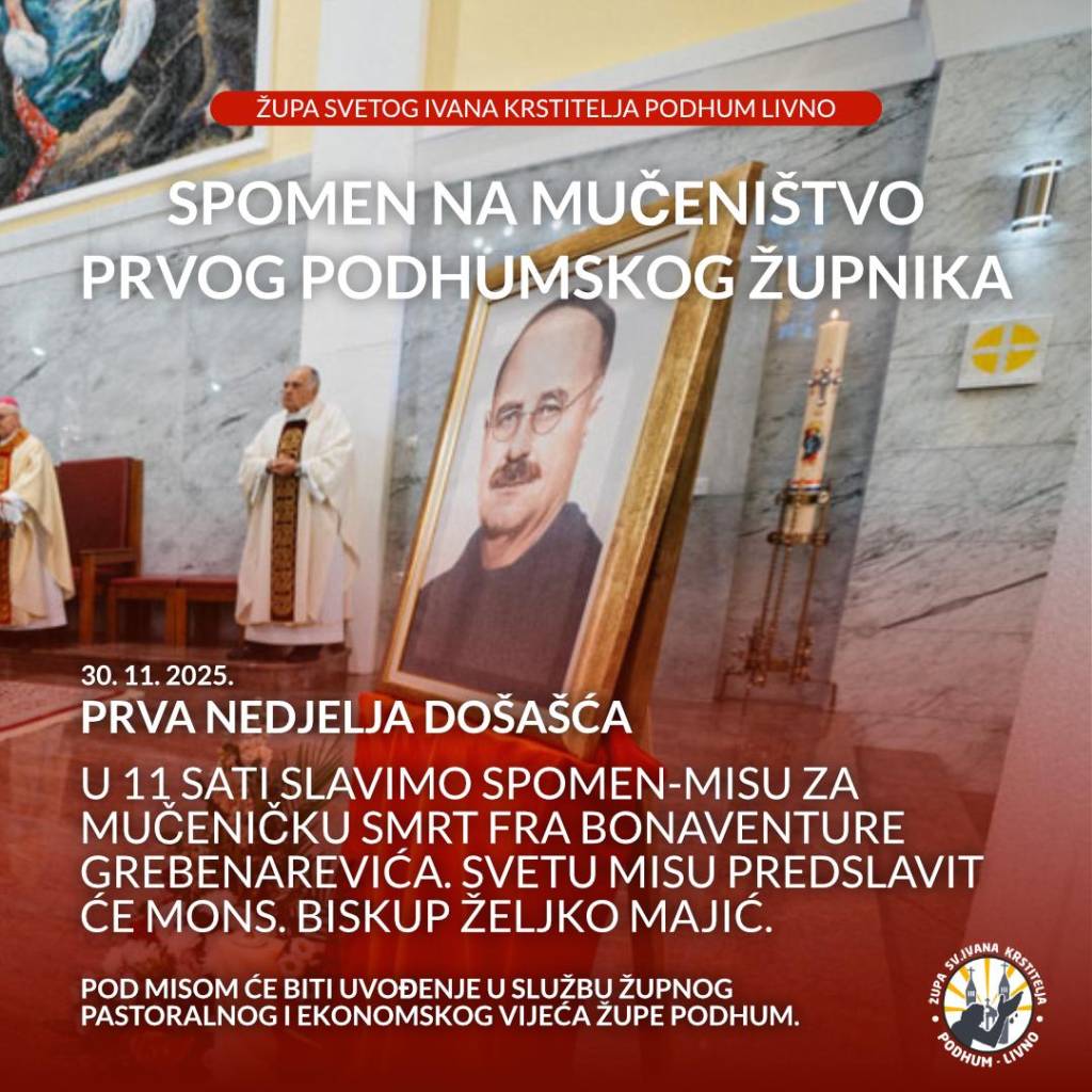 Spomen mučeničke smrti prvog podhumskog župnika fra Bonaventure Grebenarevića obilježit će se na prvu adventsku nedjelju, 30. studenog 2025., sv. Misom u 11.00 sati, koju će predslaviti biskup banjolučki mons. Željko Majić.