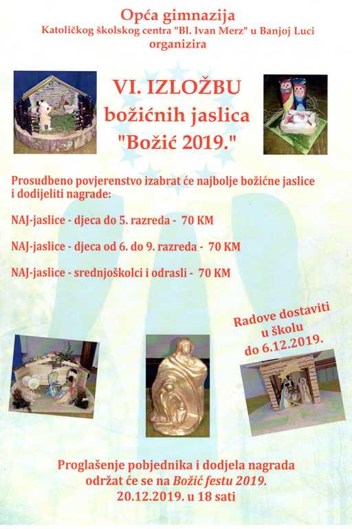 I ove godine po šesti puta Opća gimnazija “Bl. Ivan Merz” organizira u Banjoj Luci izložbu Božićnih jaslica. Svi mogu donijeti svoje ručne radove jaslica a stručni će žiri odlučiti čije su jaslice među najljepšima i pri tome pobjednike nagraditi vrijednim novčanim nagradama. Sve detaljnije informacije imate na plakatu ispod.