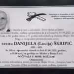 U dubokoj vjeri u uskrsnuće i život vječni javljamo svim sestrama Družbe, rodbini i prijateljima da je u Sarajevu, 1. kolovoza 2021. u 88 drugoj godini života i 55 godinu milosrdničkog služenja Bogu i bližnjemu blago u Gospodinu preminula sestra Danijela (Lucija) Škripić.