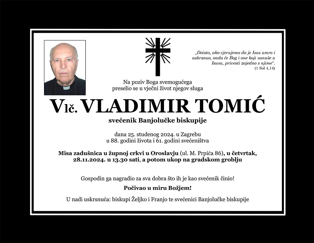U ponedjeljak, 25. studenog 2024. u Kliničkoj bolnici Dubrava (Zagreb) preminuo je nakon kraće bolesti svećenik Banjolučke biskupije vlč. Vladimir Tomić.