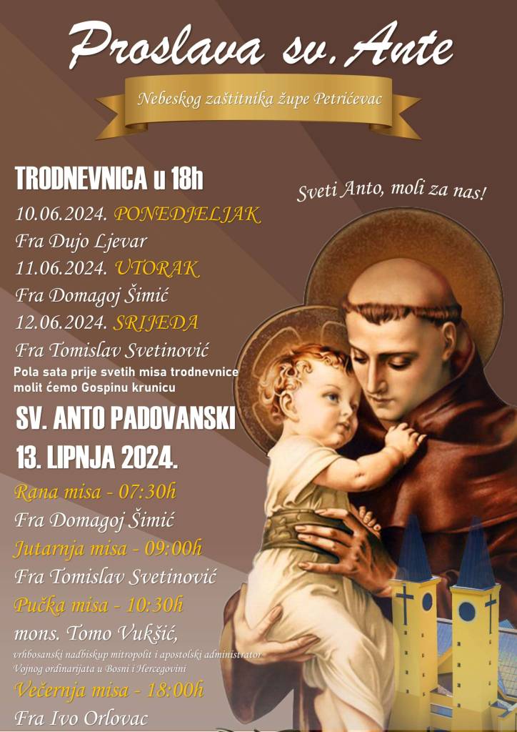 Radost nam je najaviti kako će naša samostanska i župna zajednica i ove godine proslaviti svog nebeskog zaštitnika sv. Antu Padovanskog. Samoj proslavi prethodit će trodnevnica u 18h. Pola sata prije svetih misa trodnevnice molit će se Gospina krunica.